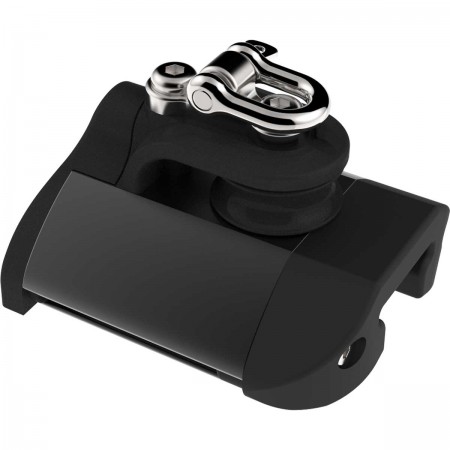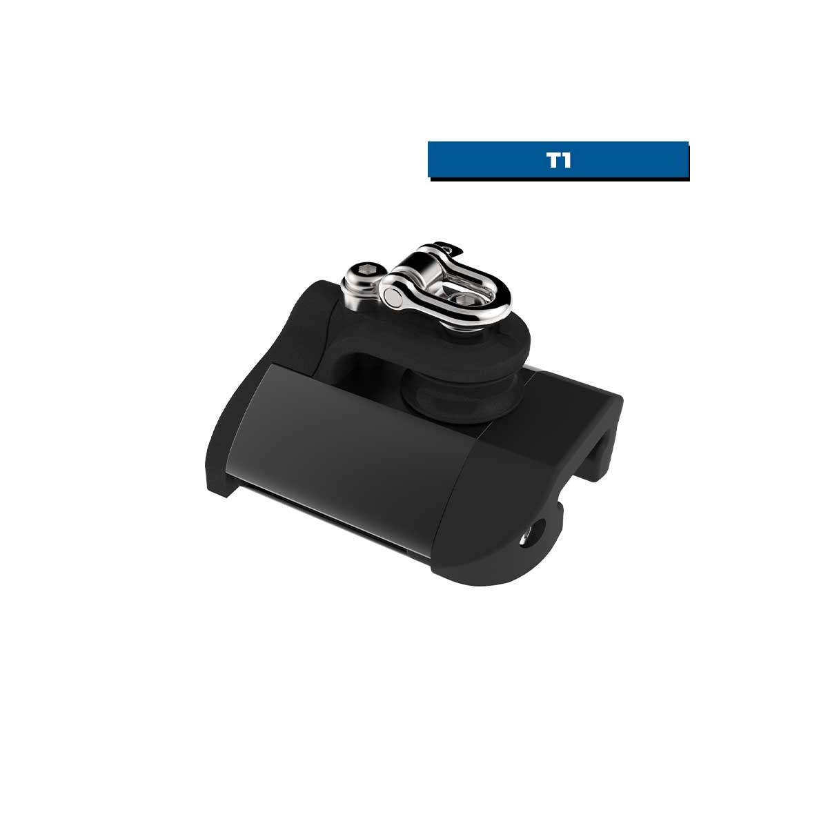 El tope final T1 HTX con polea de control y cáncamo se instala en el extremo del raíl para detener el carro del puño de escota y se utiliza para que el cable de control trabaje limpiamente en lugar de hacer que roce contra el tope final o el raíl. El ringot se utiliza como punto de amarre para completar u organizar el circuito de ajuste.