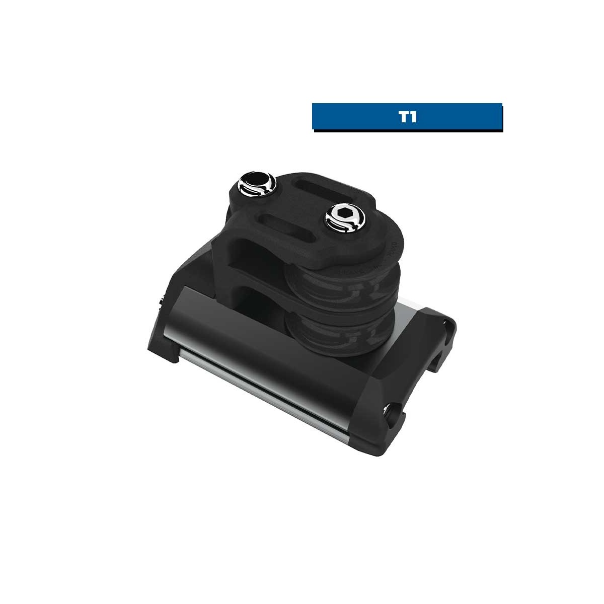 El tope de carril con polea de control doble T1 se instala en el extremo del carril para detener el carro y proporcionar dos retornos finales limpios.