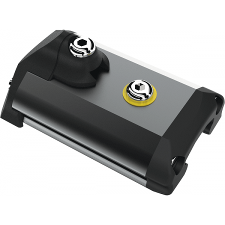 El tope T1 desnudo impide que el carro de escota se salga de la vía y actúa como límite de fin de carrera. En este caso, el tope está solo, sin roldana ni polea.