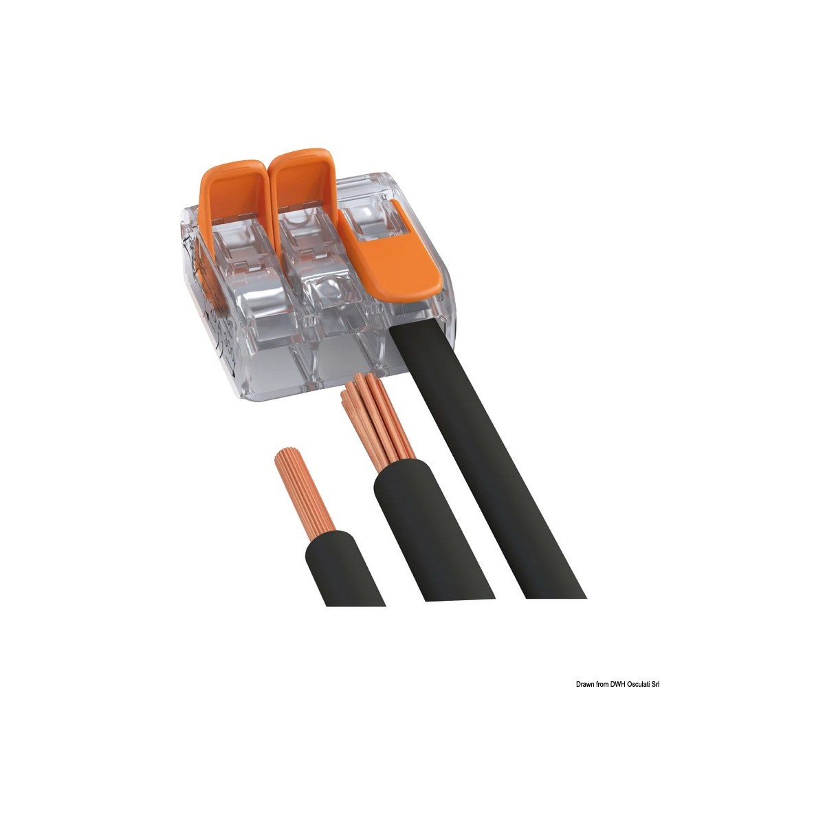 Los conectores de la serie 221 de WAGO (x50) permiten conectar todo tipo de conductores de forma rápida y segura, gracias a una práctica palanca de sujeción. Se pueden instalar en carriles DIN o atornillándolos, y sus soportes son aptos para montaje horizontal o vertical. Soportan temperaturas ambiente de hasta 85°C.