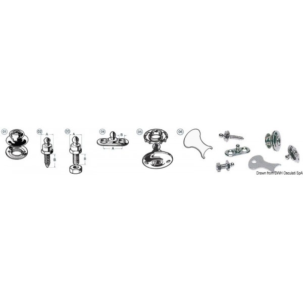 Pomos macho Tomax con collarín roscado de latón niquelado, accionamiento por empuje (x25). Bloqueo de muelle en el botón hembra.