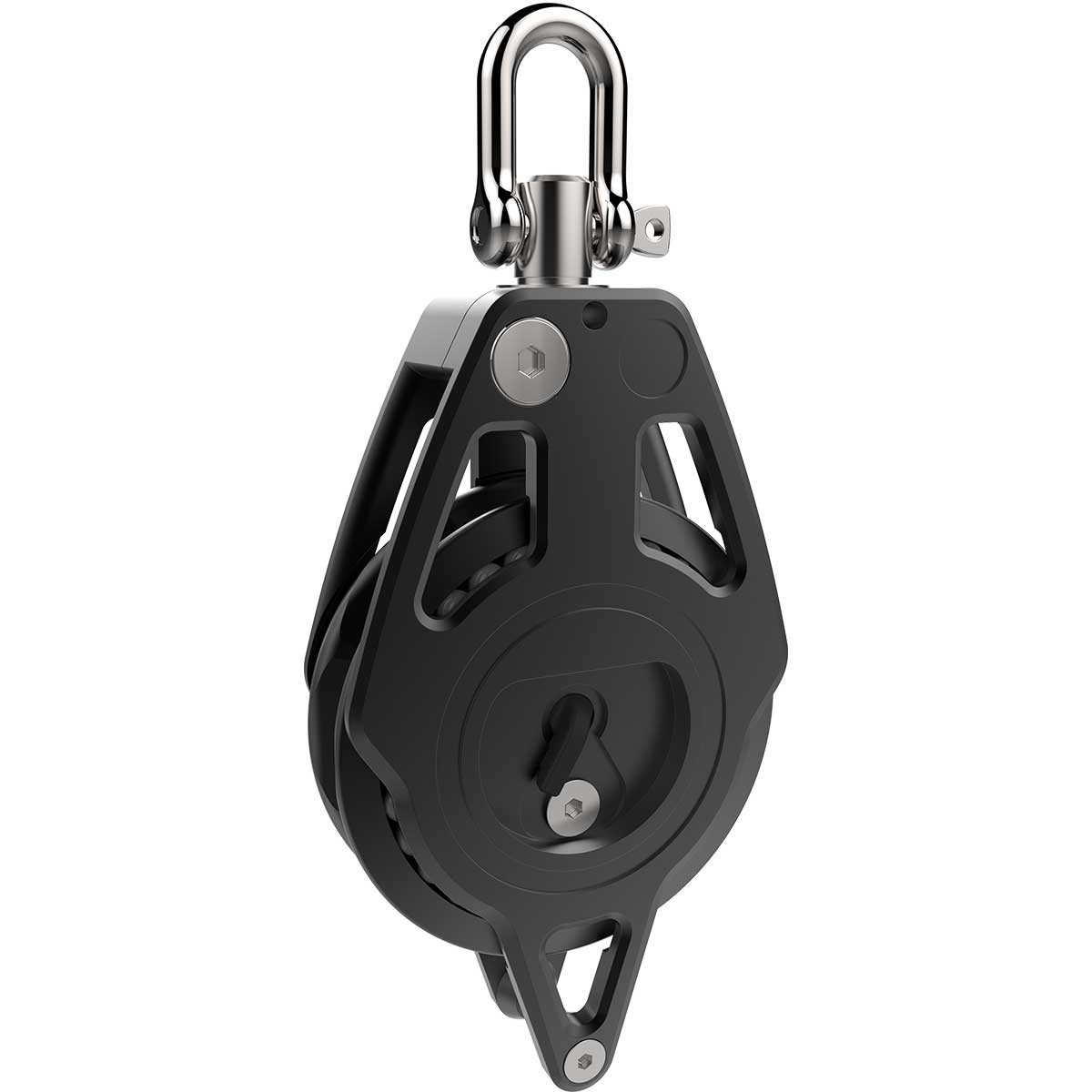 Ligero (318 g) pero seguro (carga máxima de 1.764 kg), admite cuerdas de hasta 12 mm de diámetro y gira sobre un pivote bloqueable. Los cojinetes de Delrin garantizan una rotación suave y uniforme.