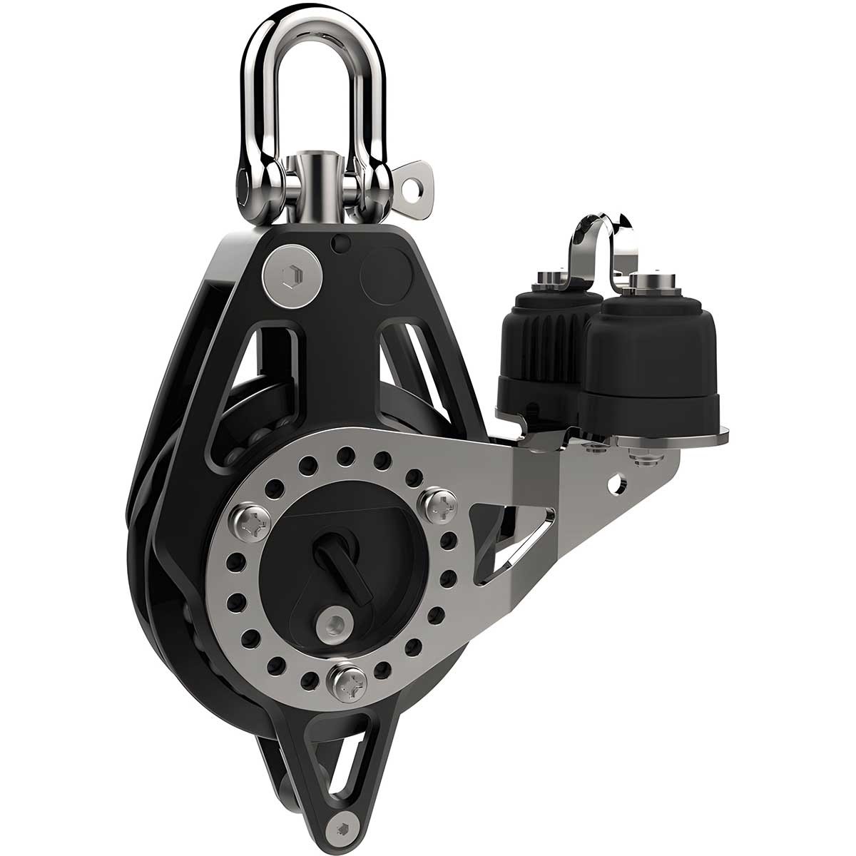 Optimice los ajustes de su escota con la polea simple Lewmar Racing Ø 80 mm, con trinquete, anilla y cornamusa. El trinquete ayuda a sujetar la escota bajo carga y la cornamusa se bloquea en el momento justo. La rótula bloqueable y los cojinetes Delrin garantizan una rotación suave.