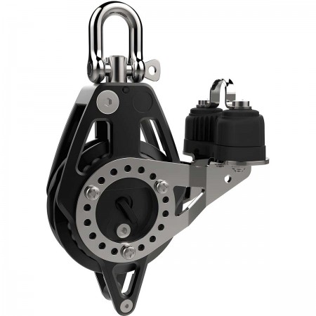 Lewmar Polea simple Racing Ø 80 mm con carraca, anilla y cornamusa. Diseñada para cuerda de hasta 12 mm, tiene una carga de trabajo de 800 kg y pesa sólo 503 g.