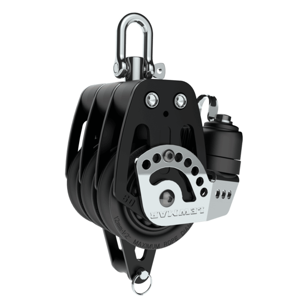 Diseñada por Lewmar, la polea triple HTX de 50 mm con anilla y cornamusa es ideal para ajustes frecuentes con alta tensión. Las bridas de aluminio, las poleas de acetal y los rodamientos optimizan la rotación. Con un peso de sólo 511 g, soporta una carga de trabajo de 800 kg y la cornamusa de 120 kg.