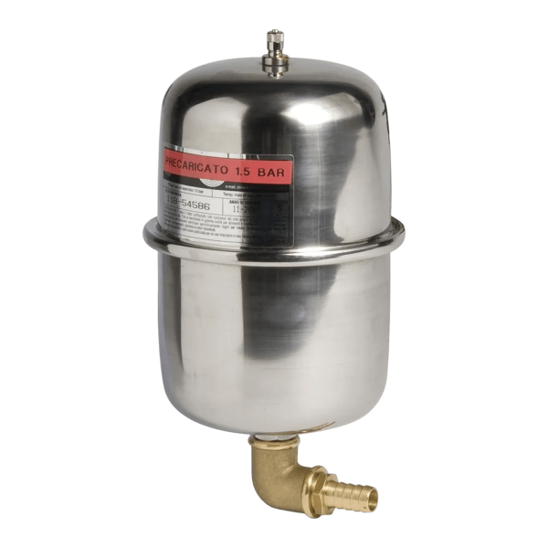 El depósito de expansión de acero inoxidable de 2 L Frigomar estabiliza la presión del sistema de agua de a bordo y limita los ciclos de la bomba, para un flujo más suave y menos ruidoso. Compacto, mide 270 mm de alto por 136 mm de ancho, con una entrada de Ø13 mm. Fácil de instalar en un circuito de agua a presión.