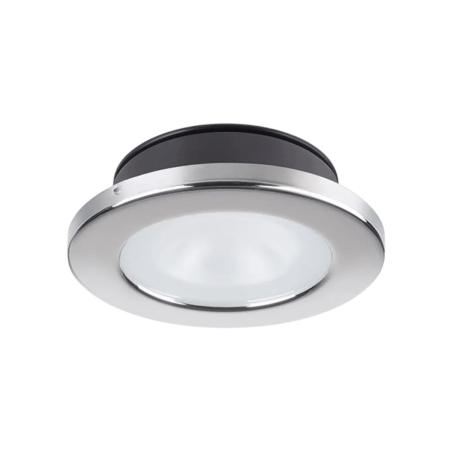 CHIARA Plafón LED empotrable blanco, 4 W, para alimentación 9-32 V CC. Con su luz blanca cálida de 3000 K, su flujo de 350 lm y su grado de protección IP66, es ideal para la iluminación interior o exterior en entornos marinos. Diámetro total: 88 mm, empotramiento: 65 mm.