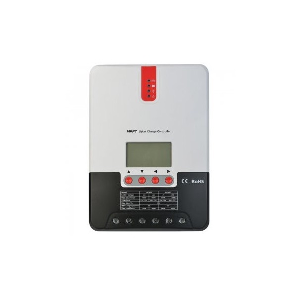 Regulador de carga fotovoltaico con algoritmo de seguimiento del punto de máxima potencia (MPPT). Además de permitir utilizar los módulos fotovoltaicos a plena capacidad incluso en condiciones de luz solar cambiantes o degradadas, permite utilizar módulos de voltaje no estándar y simplifica el cableado al conectar los módulos en serie en lugar de en paralelo.