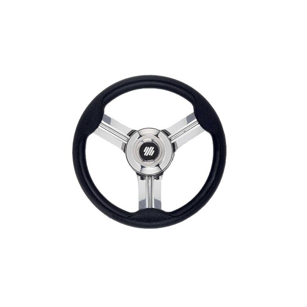 El volante V20B del fabricante italiano Ultraflex cuenta con 3 radios equidistantes de acero inoxidable y empuñadura de poliuretano. También tiene un diámetro de 3/4" con buje incluido.