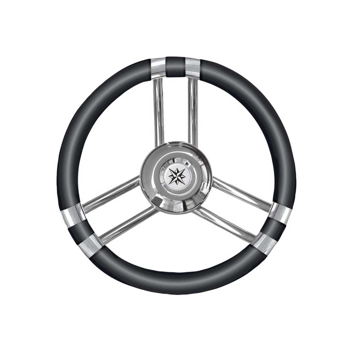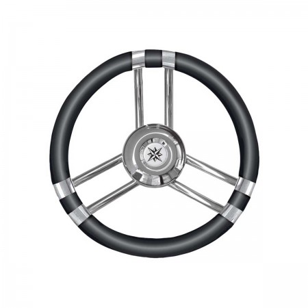 El volante T21 tiene tres radios de acero inoxidable y una corona negra de 35 cm Ø fabricada en poliuretano flexible para mejorar el agarre y la resistencia marina.