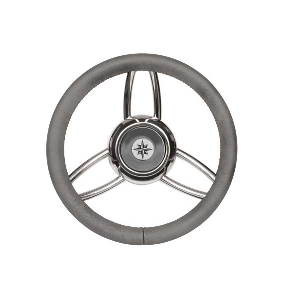 Con su marco de acero inoxidable pulido y su suave corona de poliuretano gris acabada en imitación de cuero-con costuras interiores, el volante Blitz es un diseño elegante y moderno para su cabina.