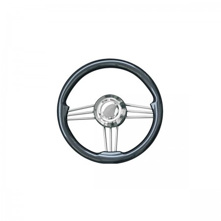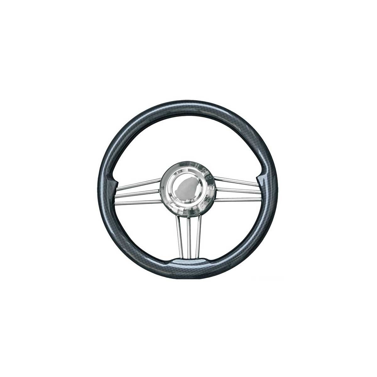 El volante T14 tiene un armazón de acero inoxidable pulido a espejo, un aro negro con efecto carbono de 35 cm de diámetro y un cubo central con cono universal para montarlo en una amplia gama de embarcaciones.