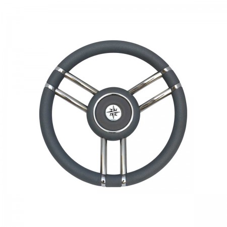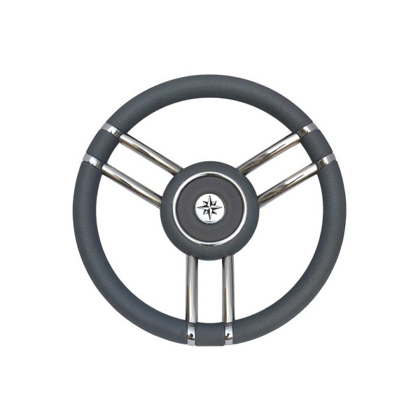 El volante Apollo tiene tres radios de acero inoxidable pulido y una corona de poliuretano gris de Ø 35 cm para mejorar el agarre y la resistencia marina.