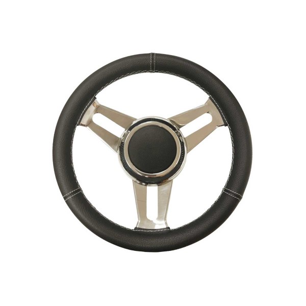 El volante T30 de cuero negro tiene radios y buje de acero inoxidable pulido a espejo. Con sus 35 cm de diámetro, se adapta fácilmente a los habitáculos con poco espacio.