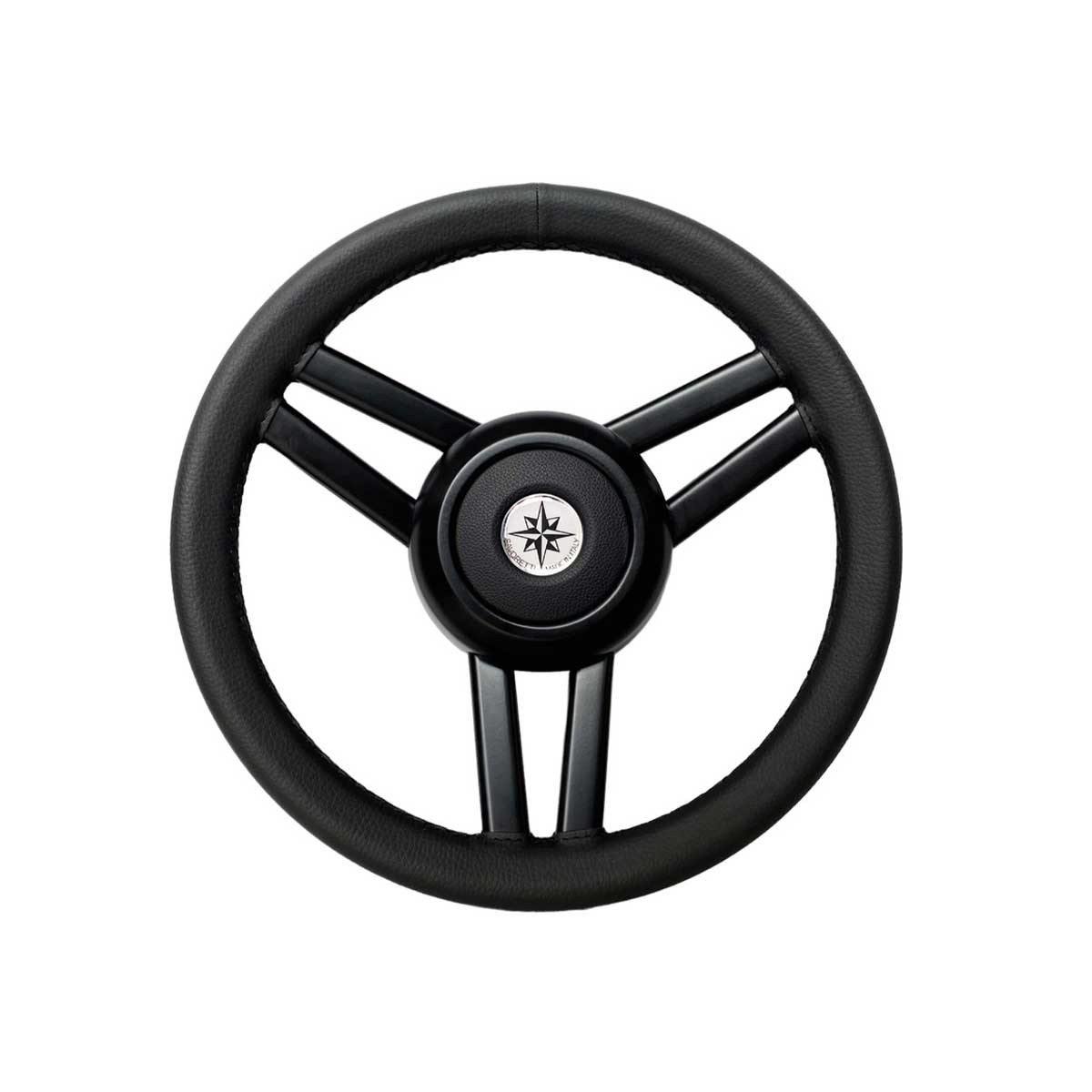 El volante T25 Ghost negro está forrado en cuero cosido a mano con radios de acero inoxidable pintados en negro y buje universal.